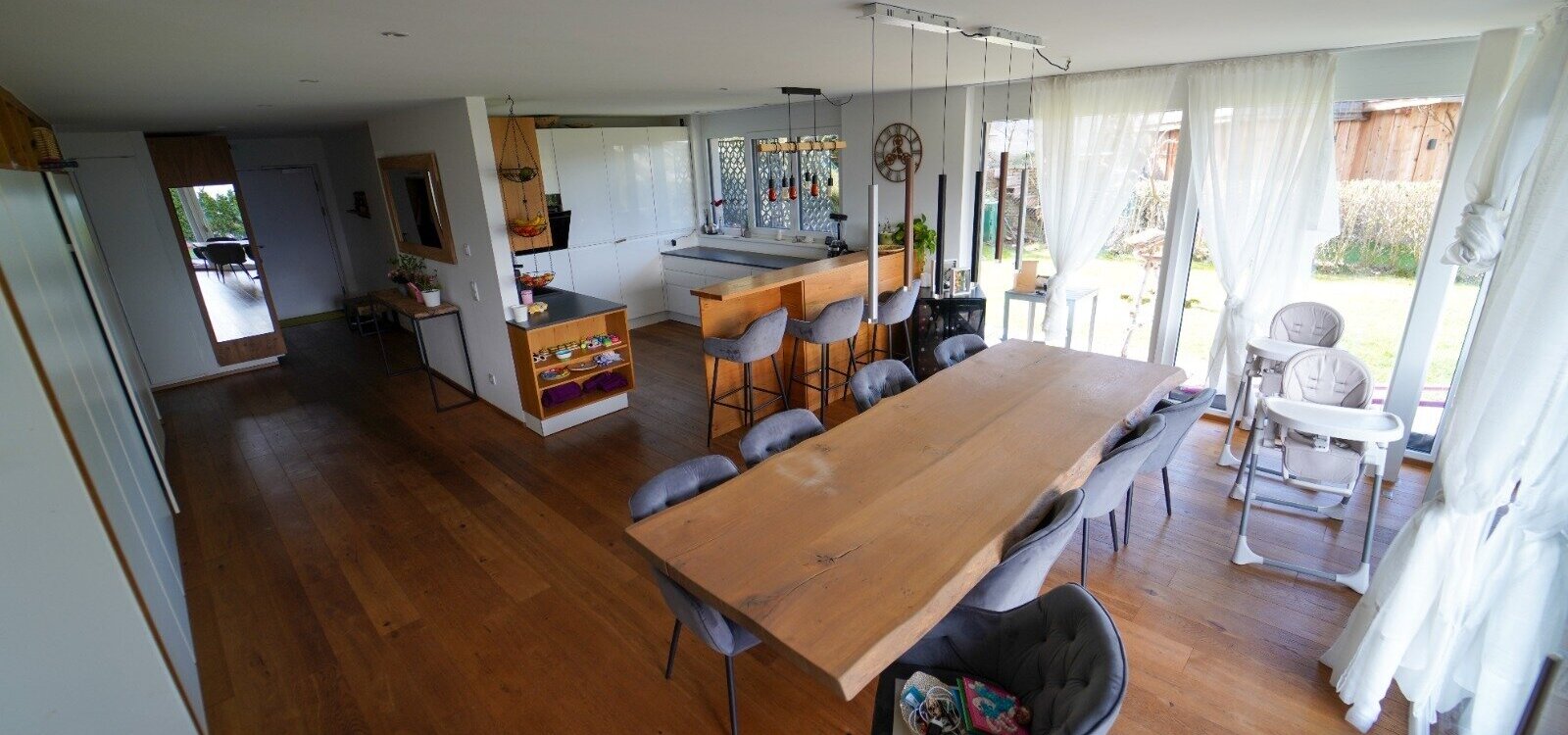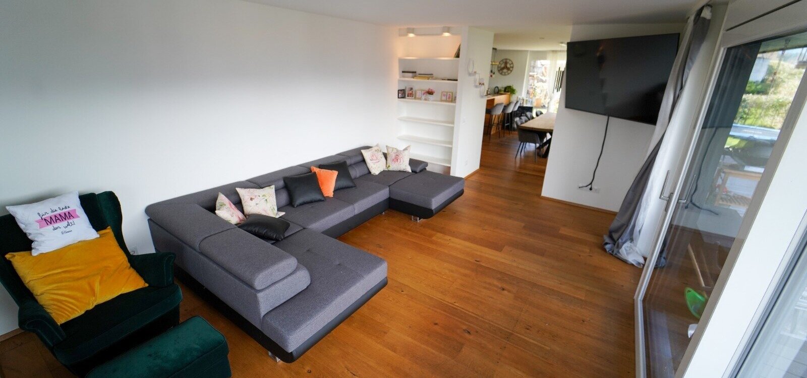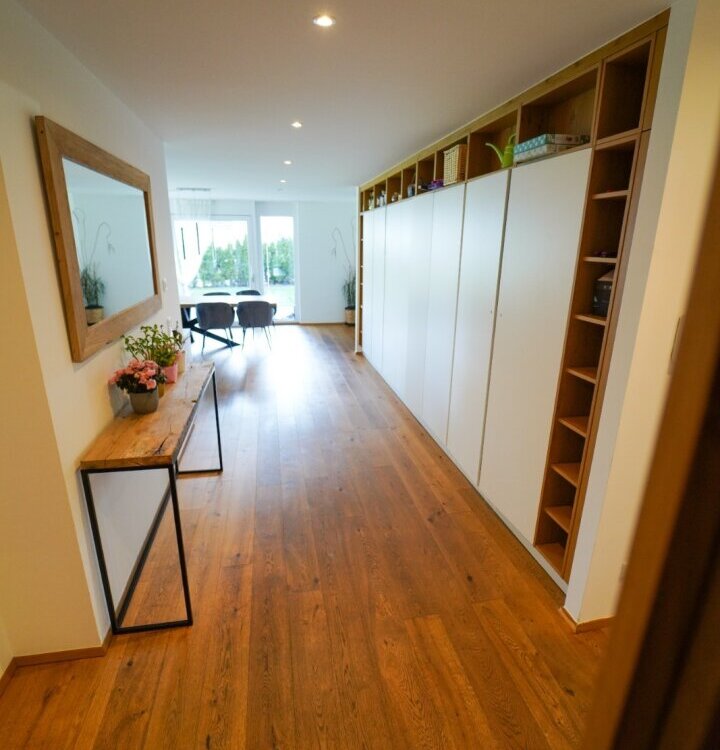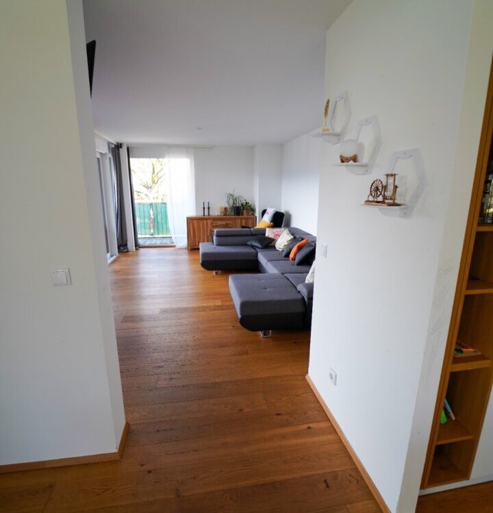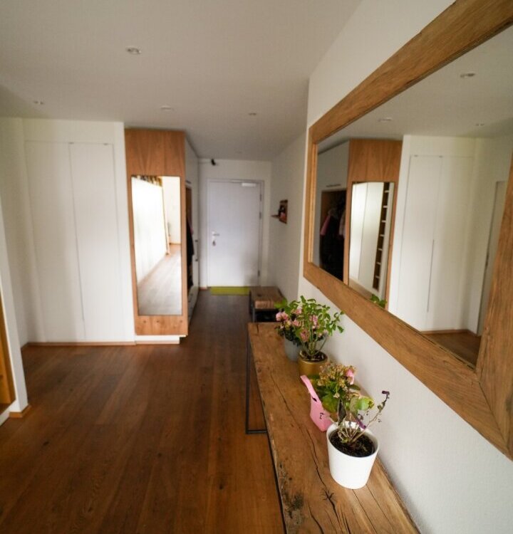Die Wohnung selber ist im Erdgeschoß aufgeteilt in einen großzügigen, loftartigen Wohn-/Küchen-/Essbereich von dem man auf die Terrasse und den anschließenden Garten gelangt, mit herrlichen Blick auf das Inntal und die Nordkette. Auf dieser Ebene befindet sich auch ein eigenständiger Wohnungsbereich, mit Badezimmer für z.B. Besuch, Au-Pair, etc. und ein Kinderzimmer oder Arbeitszimmer.