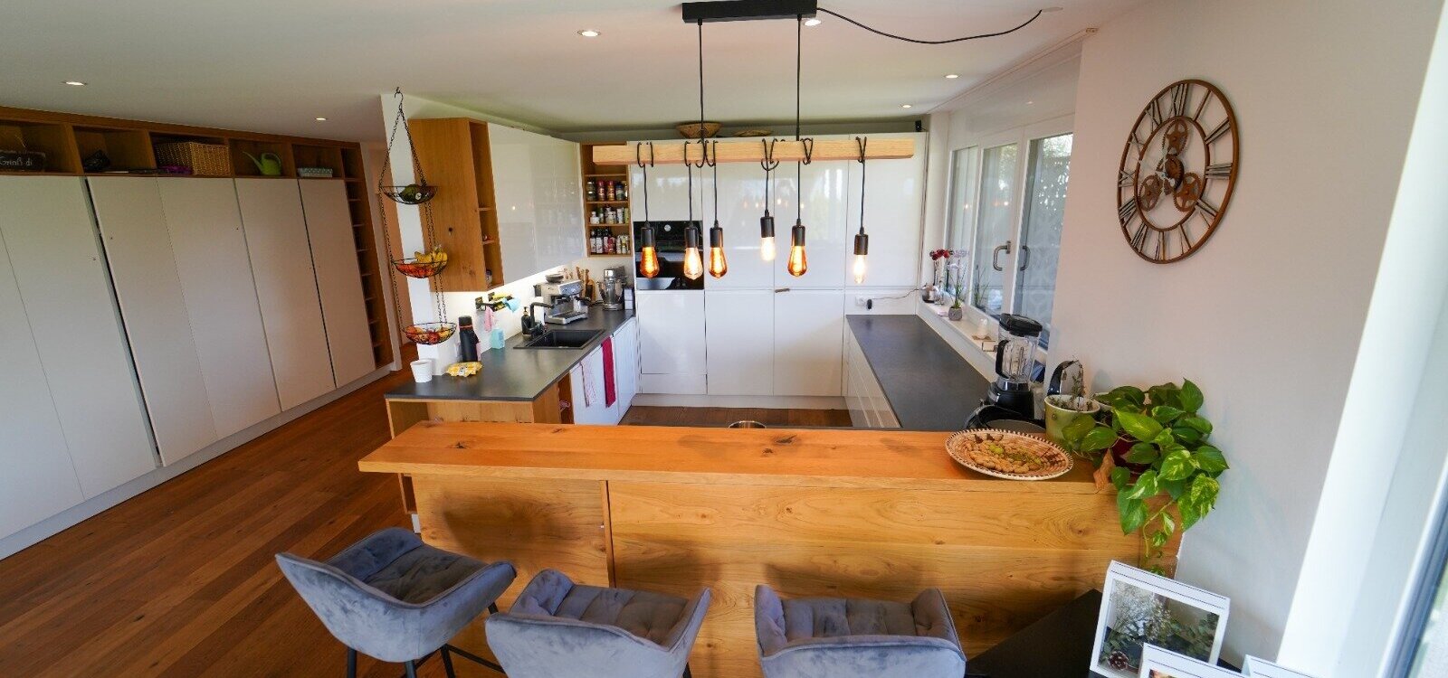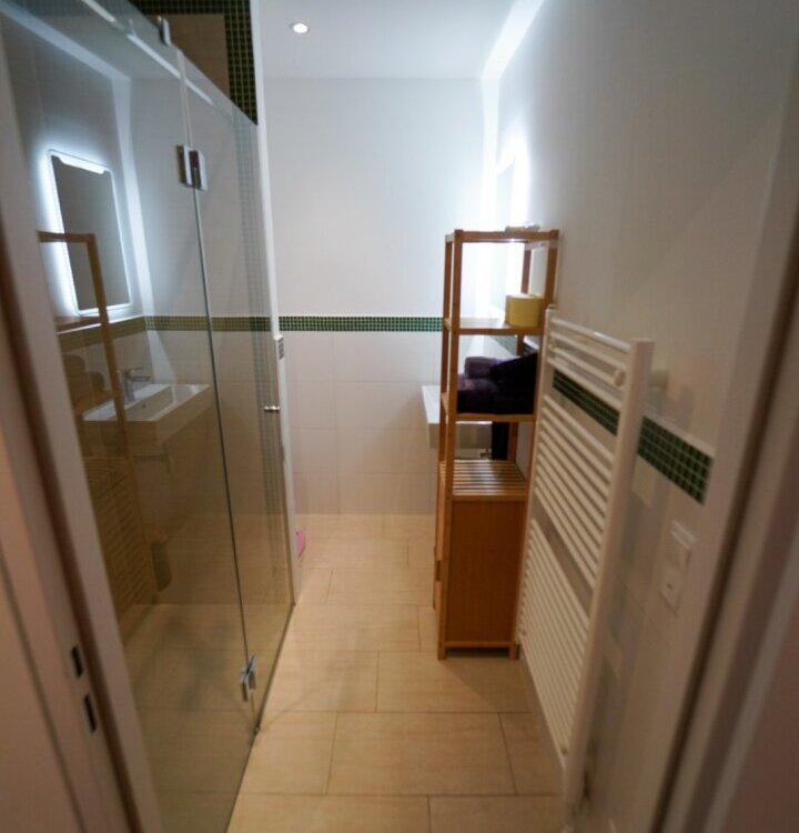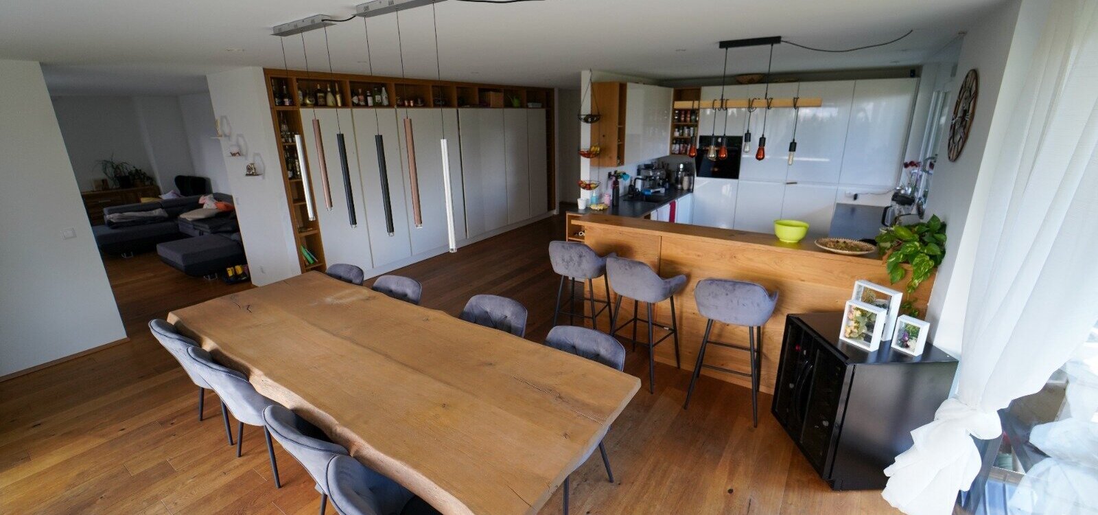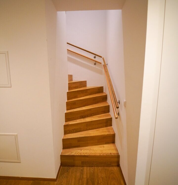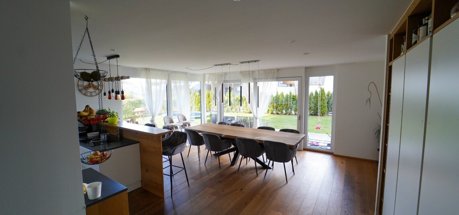 Die Wohnung selber ist im Erdgeschoß aufgeteilt in einen großzügigen, loftartigen Wohn-/Küchen-/Essbereich von dem man auf die Terrasse und den anschließenden Garten gelangt, mit herrlichen Blick auf das Inntal und die Nordkette. Auf dieser Ebene befindet sich auch ein eigenständiger Wohnungsbereich, mit Badezimmer für z.B. Besuch, Au-Pair, etc. und ein Kinderzimmer oder Arbeitszimmer.
