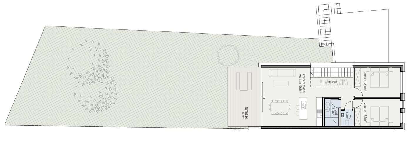 Die Materialwahl folgt einem konsequent nachhaltigen Baukonzept. Im Mittelpunkt steht der Einsatz natürlicher, ökologischer Baustoffe - es handelt sich um ein Niedrigenergiehaus!