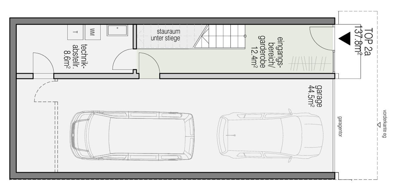 Im Untergeschoss (ebenerdiger Zugang) befindet sich neben dem Eingangsbereich ein großzügiger Garderobenbereich, die Garage (mit Platz für 2 PKW und Fahrräder), sowie ein Technik- und Hauswirtschaftsraum – mit Anschlussmöglichkeiten für Waschmaschine und Wäschetrockner.