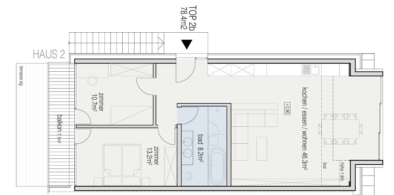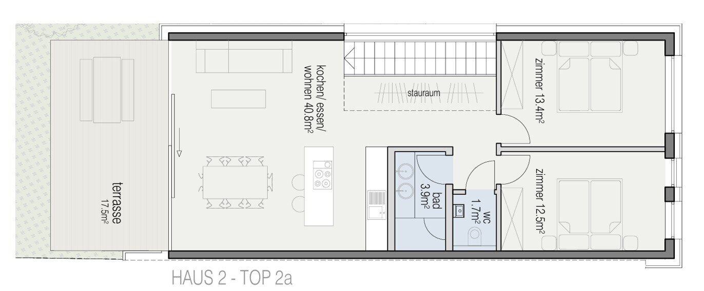 Wenn man die einläufige Treppe ins Erdgeschoß hinauf geht, hat man sofort den direkten Blickbezug zum Koch-/Essbereich, welcher in Richtung Süden, in die vorgelagerte, überdachte Terrasse, sowie den großzügigen Garten übergeht. Zwei ruhige Schlafzimmer mit nordwestlicher Ausrichtung, sowie ein Bad und ein Gäste-WC komplettieren diese Ebene.