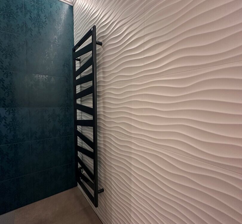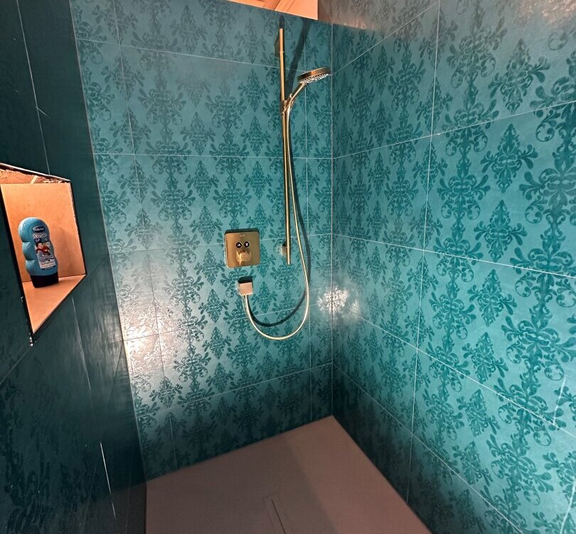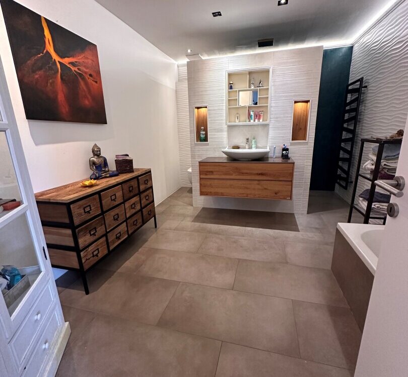 Das Badezimmer dieser Wohnung ist eine kleine Oase der Entspannung - ausgestattet mit einer Badewanne und einer großen Dusche. Praktische Extras wie ein Wasch- und Trockenraum sorgen dafür, dass der Alltag bequem und stressfrei verläuft.