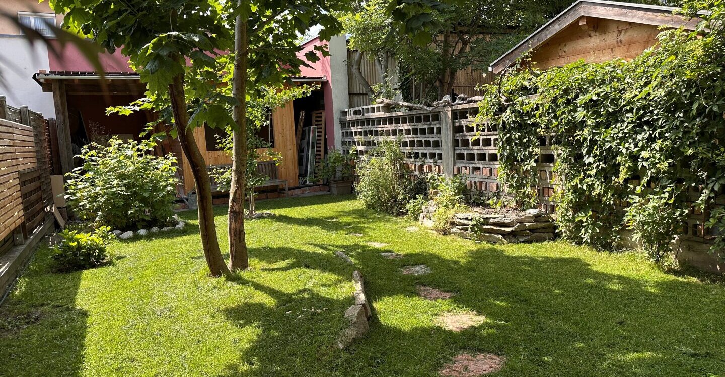 Der idyllische Garten hat eine Fläche von ca. 95,00 m², ist komplett eingegrenzt, herrlich begrünt und mit einem neuen, großzügigen Gartenhaus bestückt - eine Hälfte für die Gartengeräte, die andere Hälfte zum Chillen für die Kinder, etc.