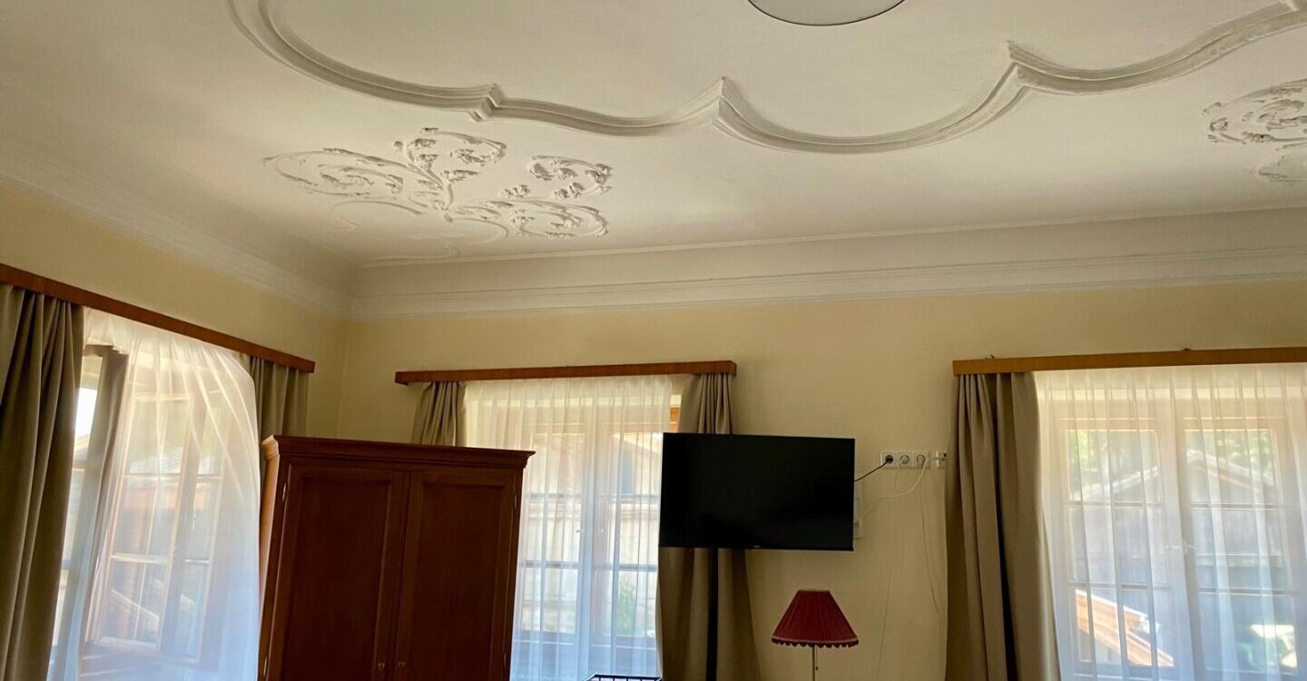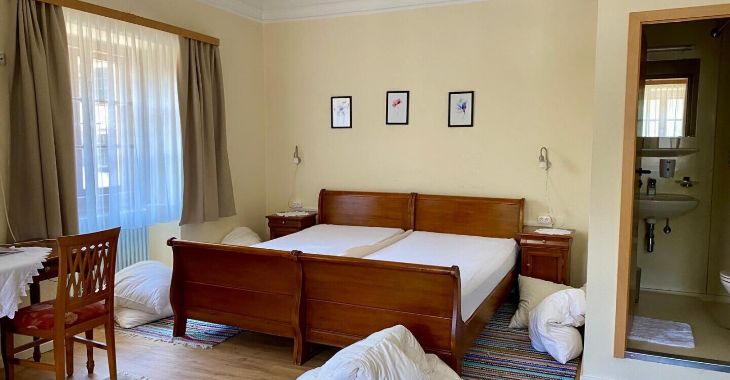 Im 1. OG befindet sich ein großzügiger Gang/Mittelraum, der als Aufenthaltsfläche dient, von hier ist nach Osten und Westen der Zugang zu den 7 Gästezimmern, die mit kleinen Badezimmern ausgestattet sind, sowie einem Aufenthaltsraum mit einer kleinen Küche, Bügelzimmer, Waschraum und eine allgemeine WC-Anlage. Von hier gibt es auch einen separaten Zugang von außen, der unter anderem in den Garten führt.