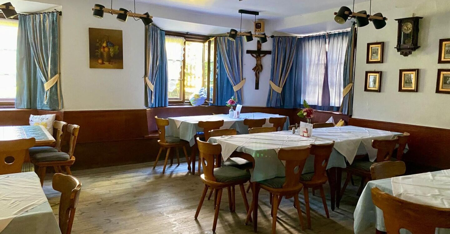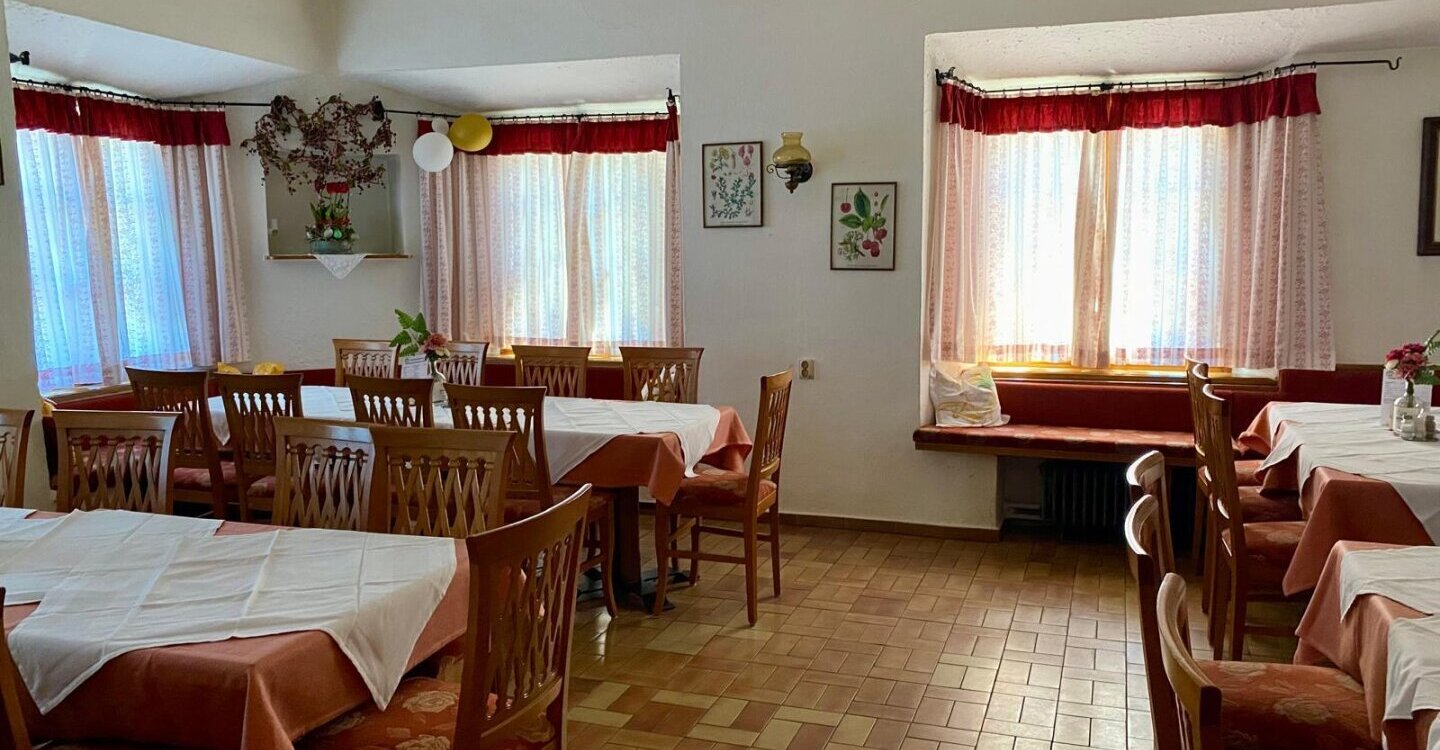 Das denkmalgeschützte Gebäude verfügt über einen großzügigen Eingangsbereich mit Rezeption/Barbereich und historischem Gewölbe. Es gibt zwei sehr gemütliche Gaststuben, beide mit Kachelofen. Der Küchenbereich, mit Lager und Kühlraum ist sehr großzügig angelegt, jedoch teils sanierungsbedürftig. WC-Anlagen sind im Erdgeschoß vorhanden.