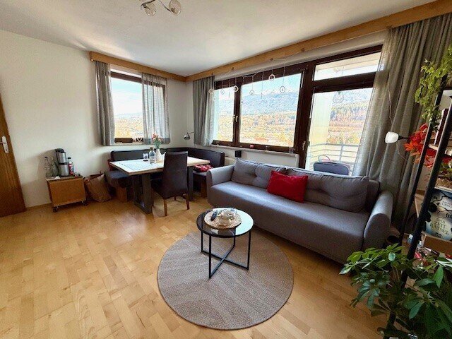 Vom großzügigen Wohnraum gelangt man einerseits in die kleine separate Einbauküche, mit Fenster Richtung Osten und andererseits auf den Balkon, der nach Süden ausgerichtet ist und auf Grund der Lage im 8. Stock eine herrliche Aussicht u.a. auf den Patscherkofel gewährt.