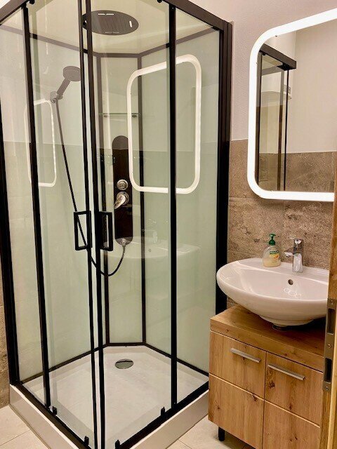Die Bäder wurden nach neustem Standard mit hochwertigen, großflächigen beigen Fliesen, eleganten Duschkabinen und Waschbecken und natürlich mit Waschmaschinenanschluss ausgestattet. Eine Zentralheizung, auf Basis von Fernwärme und Fußbodenheizung versorgt das ganze Haus gemäß moderner Standards! Eine durchdachte, stylische Einbauküche rundet das Wohnprogramm perfekt ab, sodass Sie jederzeit, ohne großen Aufwand einziehen können!